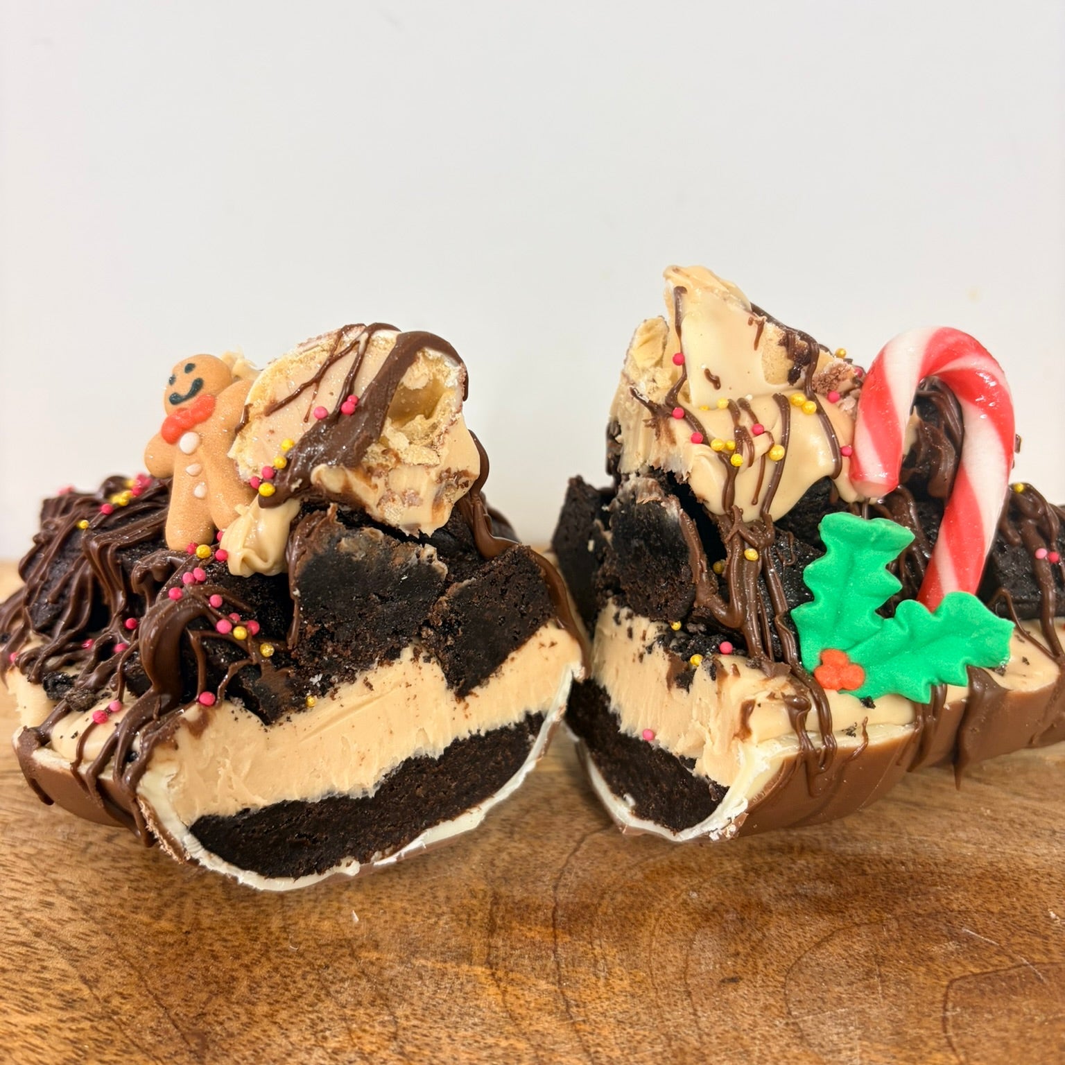 Starting with a large Kinder Santa, filled with our Triple Chocolate Brownies, filled to the brim with Kinder Bueno Sauce, topped with more Triple Chocolate Brownie, Kinder Sauce, Nutella, Kinder Bueno Pieces and Christmas Decorations.