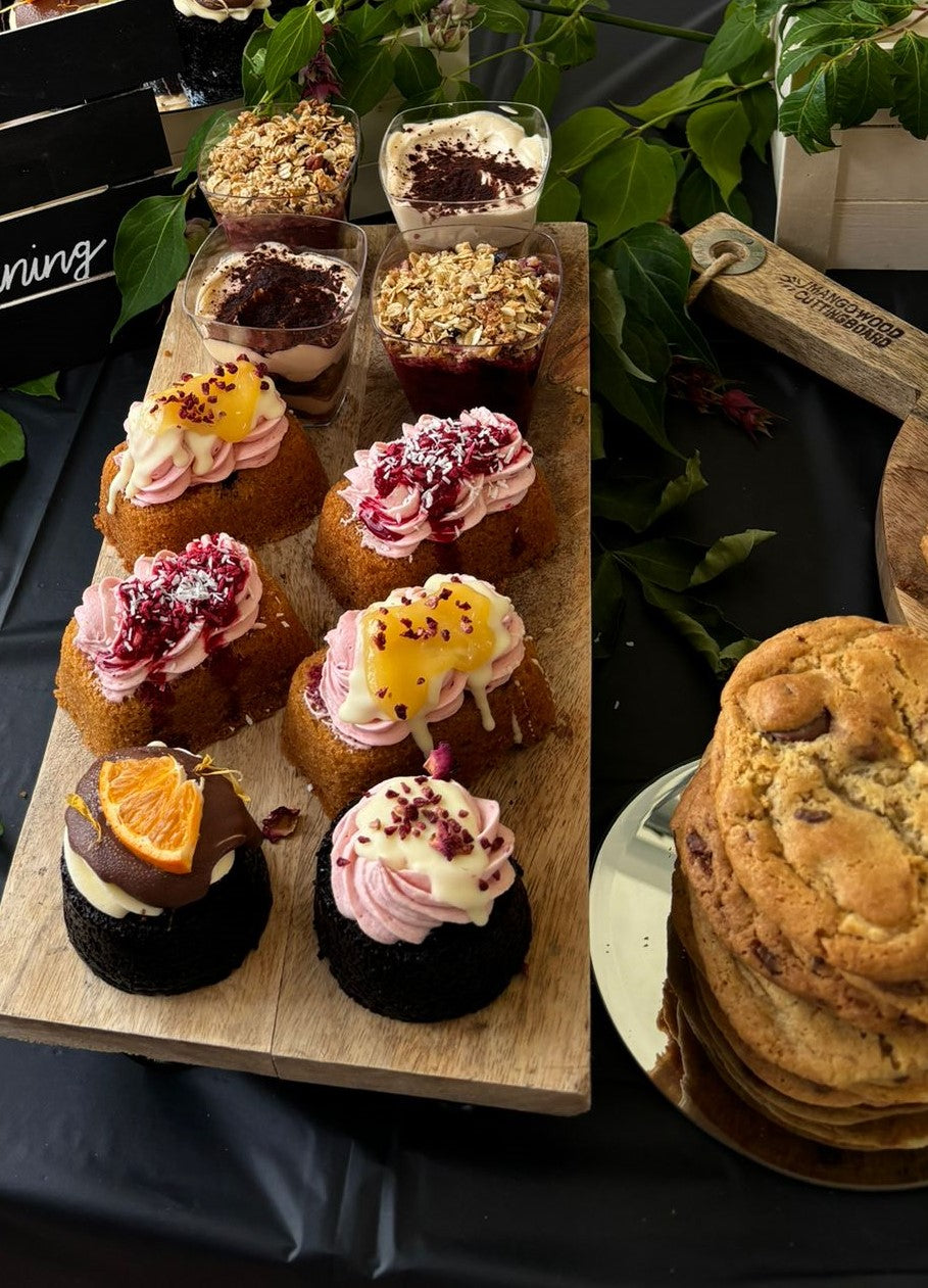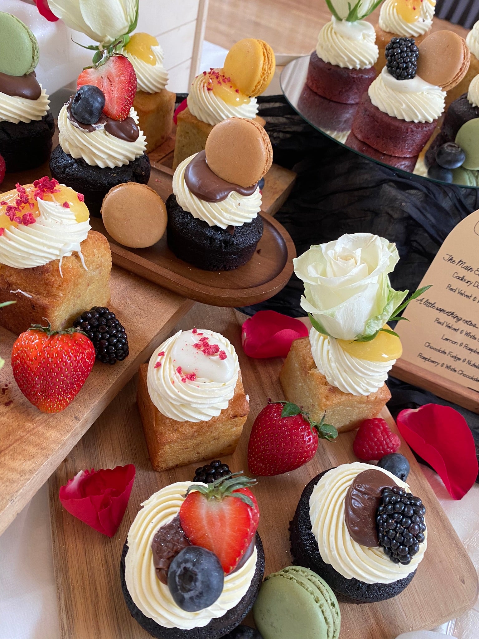 Inside, you’ll find a curated array of mini cakes, dessert pots, cookies, brownies & chocolate-dipped strawberries — each one a bite-sized showcase of the flavours and quality we bring to every wedding cake and dessert table. Each sample is handcrafted, beautifully presented, and bursting with the same care and deliciousness as our full-size centrepieces.